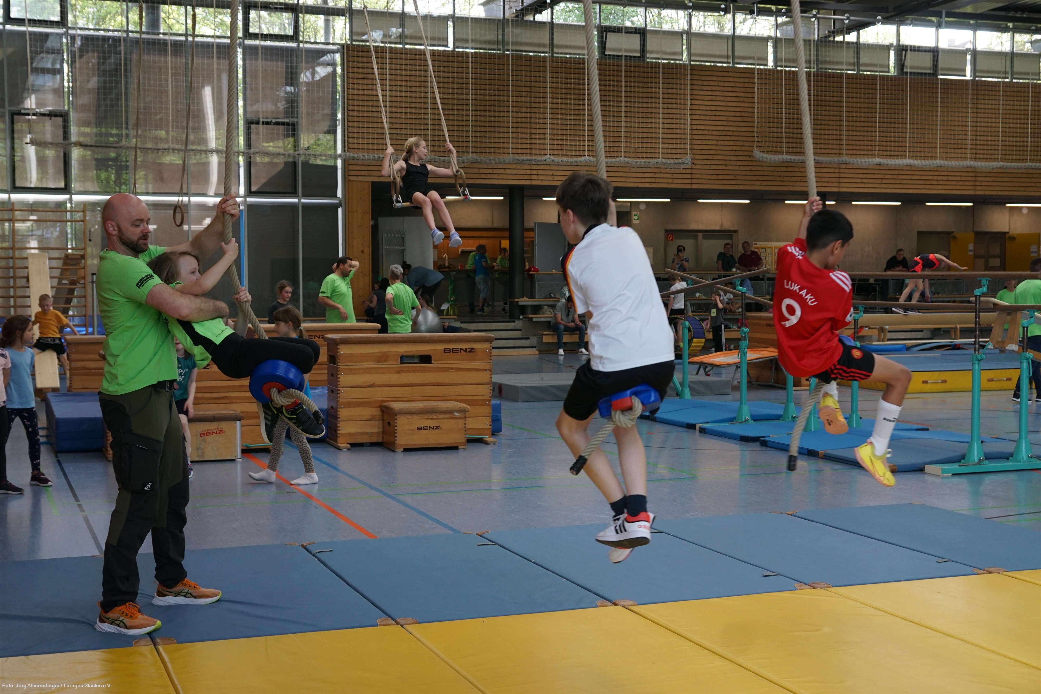 Spaß, Toben und Abenteuer standen am 13.04.2024 bei den STAUFEN Tobe-Tage in Albershausen auf dem Programm. Der TSGV Albershausen und der Turngau Staufen verwandelten vergangenen Samstag die Schulsporthalle in der Schulstraße in einen ganz besonderen In-door-Abenteuerspielplatz. Um die 250 Kinder nutzten trotz der sommerlichen Temperaturen begeistert das Angebot. Die Kinder erwartete in der großen Sporthalle eine abwechslungsreiche Bewegungslandschaft mit über 20 Stationen. Hier war garantiert für jeden etwas dabei. Die Geräteräume der Schulsporthalle wurden komplett ausgeräumt, einige Turngeräte aus der TSGV-Halle in der Schafhofstraße geholt und auch der Inhalt des Turni-Mobils wurde wieder zum Einsatz gebracht. So gab es unzählige Möglichkeiten zum Hüpfen, Rutschen, Balancieren, Klettern, Schwingen, Werfen und Rollen.
